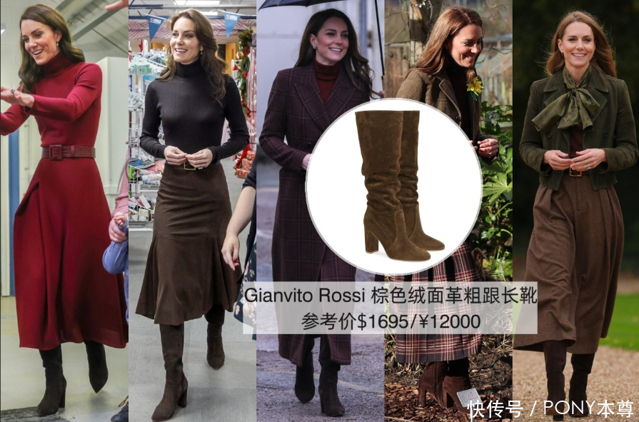 凯特王妃秋冬对于高跟长筒靴的喜爱,是有目共睹的!搭配鱼尾裙、连衣裙等,都选择了这款麂皮棕色长筒靴,既百搭又能体现她一靴多穿的穿搭智慧。
