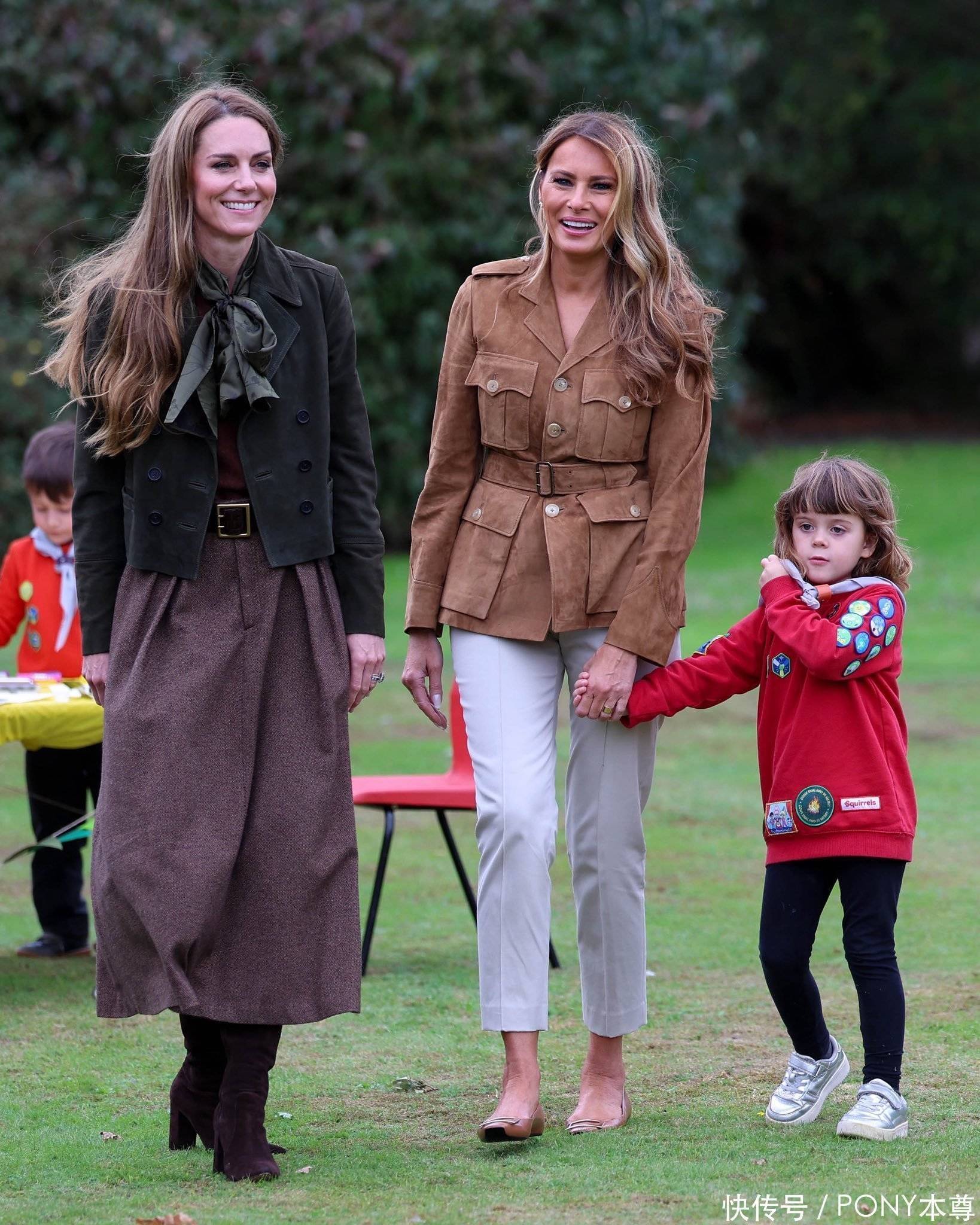 想要身材比例好,还可以通过高跟鞋来提升!相对于梅拉尼娅的平底鞋,凯特王妃一双麂皮棕色长筒靴,是不是视觉效果超明显!