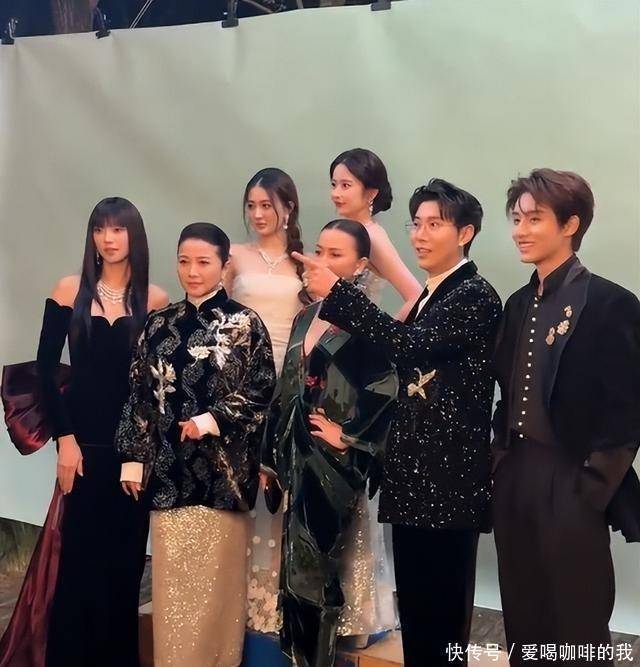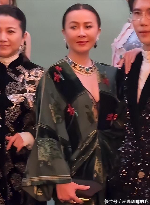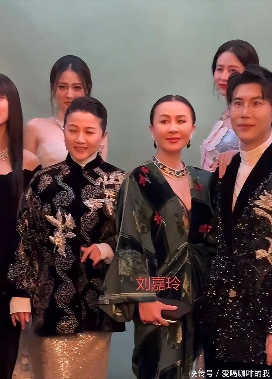 刘嘉玲走红毯时身穿黑色丝绒深V礼服,采用真空设计,无内衣痕迹。礼服贴合身形,突出肩颈线条,该部位皮肤紧致,无下垂迹象。她搭配CIGA LONG绿松石项链,价值达千万级别,包括项链、耳环和戒指。发型为大背头,姿态笔直。合影环节,她站C位,颜丙燕紧随其后,徐璐和颖儿位于后排。