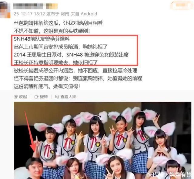 牵扯出的“作陪”丑闻 2025年末,距离春节不足两月,内娱圈一则解约纠纷引发连锁反应。艺人鞠婧祎与老东家丝芭传媒正式撕破脸,双方就合同条款及报酬问题互相曝光证据,场面一度失控。丝芭传媒发布的声明显示,合作期间已向鞠婧祎支付款项累计达1.3亿元,每月另有25万元固定补贴,以此反驳其“被压榨”的说法。 就在双方争执不下时,一名鞠婧祎前同事突然发声,曝光了行业内的隐性规则:部分经纪公司为攀附资本资源,会安排旗下年轻女艺人参与各类私人饭局作陪。该爆料者明确指出,丝芭传媒曾多次组织女艺人参加特定圈层的聚会,而王思聪正是这类聚会的核心人物之一。