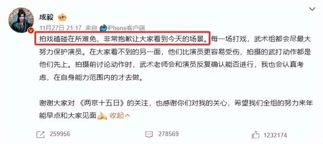 晚上成毅发微博报平安,说“拍戏磕碰在所难免”,还特意提到“武术组比演员更容易受伤”。这番话让网友动容,明明自己伤得最重,却还替他人着想。