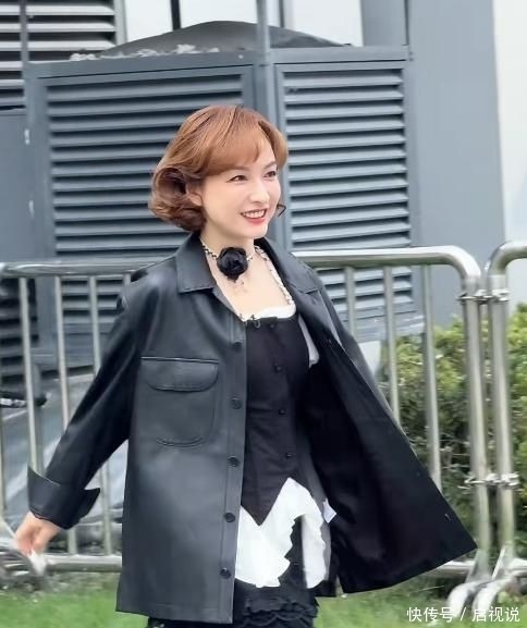 35. 她本次的造型走的是稳重路线:黑色皮衣搭配同色系短裙,卷曲长发用小巧发饰点缀,整体风格既干练又不失少女感。