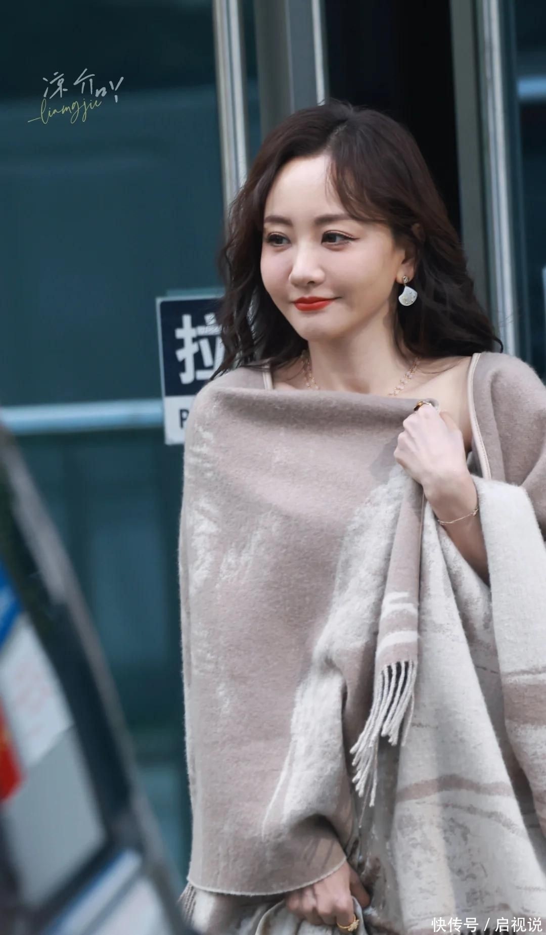 10. 视频中她似乎身穿一袭露肩设计的礼服长裙,外搭同色系薄纱披肩,整体造型温婉优雅又不失高级感。那一头自然垂落的波浪卷发更添几分女性柔美气质。