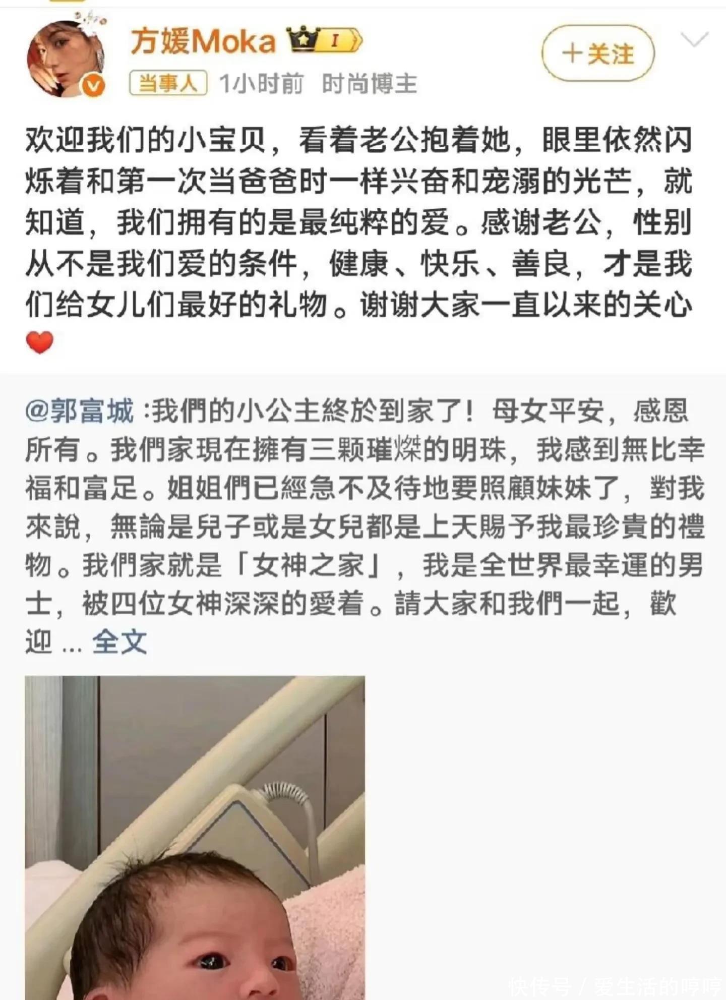 阅读文章前,麻烦您动动发财的小手“点赞、关注”这样可以给您带来不一样的参与感,创作不易,感谢大家的陪伴和支持!方媛这恢复得太快了吧,还在坐月子身材就像没生过孩子的一样,这状态嫩得能掐出水来,老郭喜提三个女儿,看得出来也很开心!夫妻俩也越来越有夫妻相了,月子都还没坐完,就跑出来给郭富城大寿!